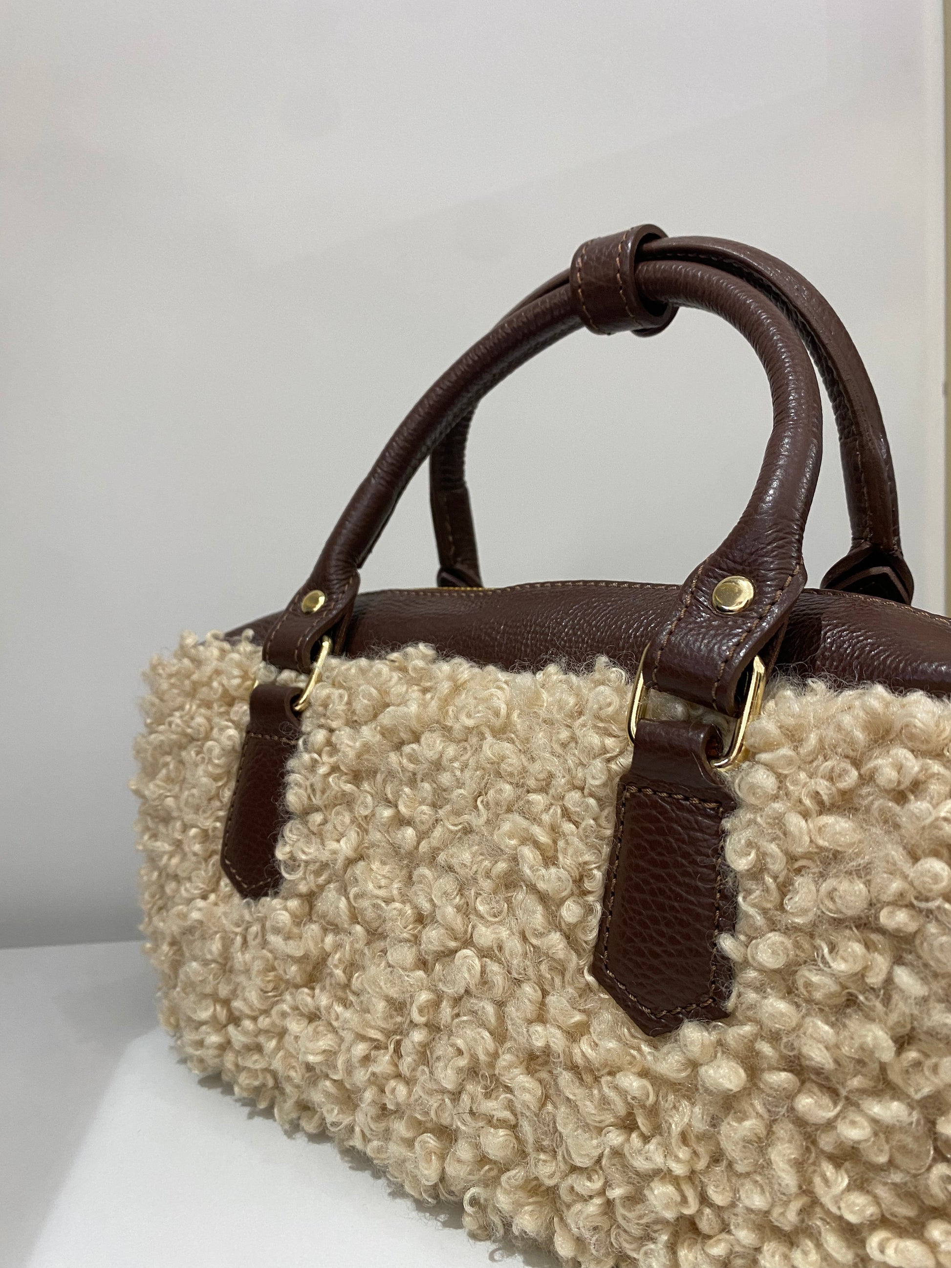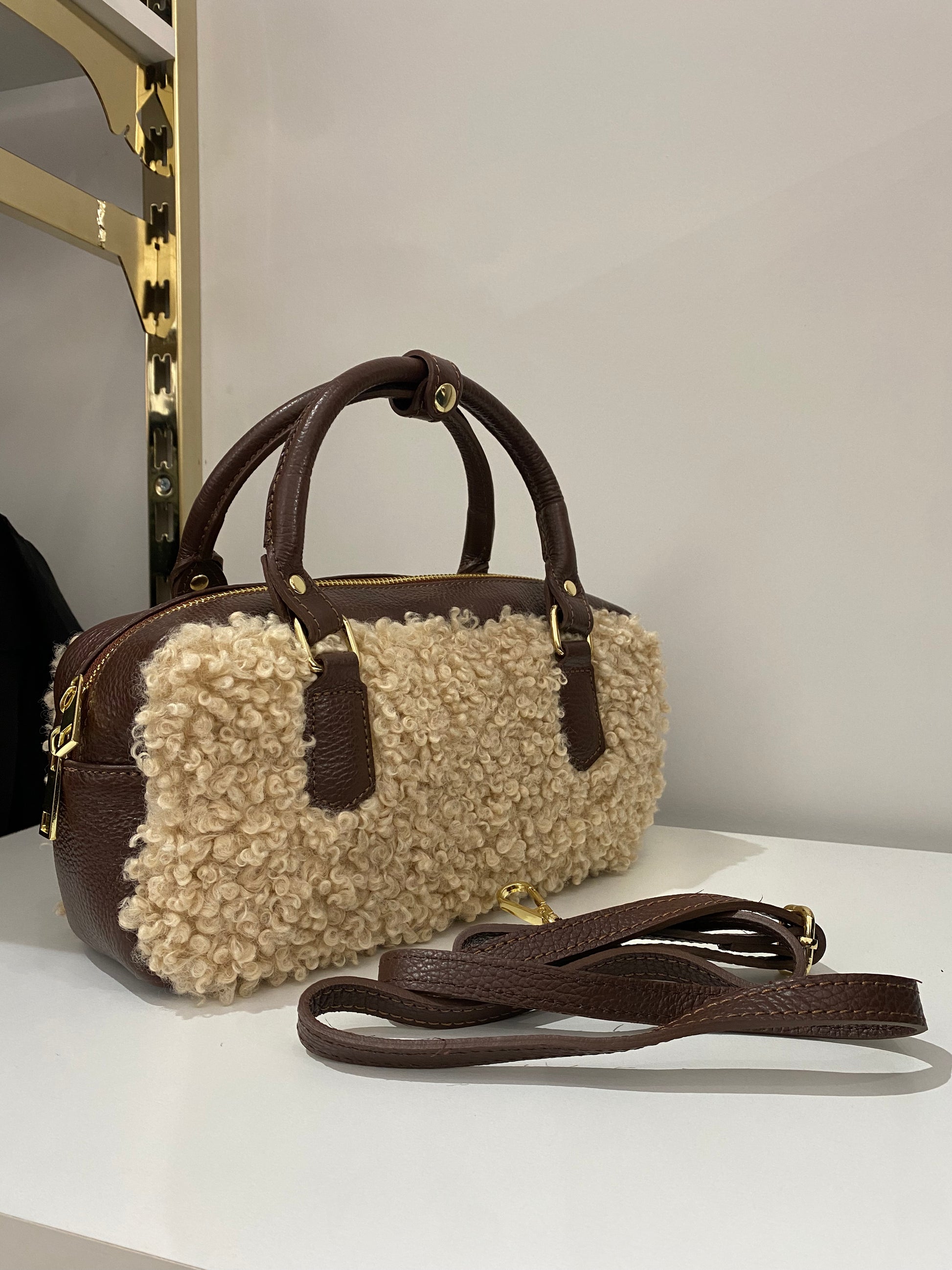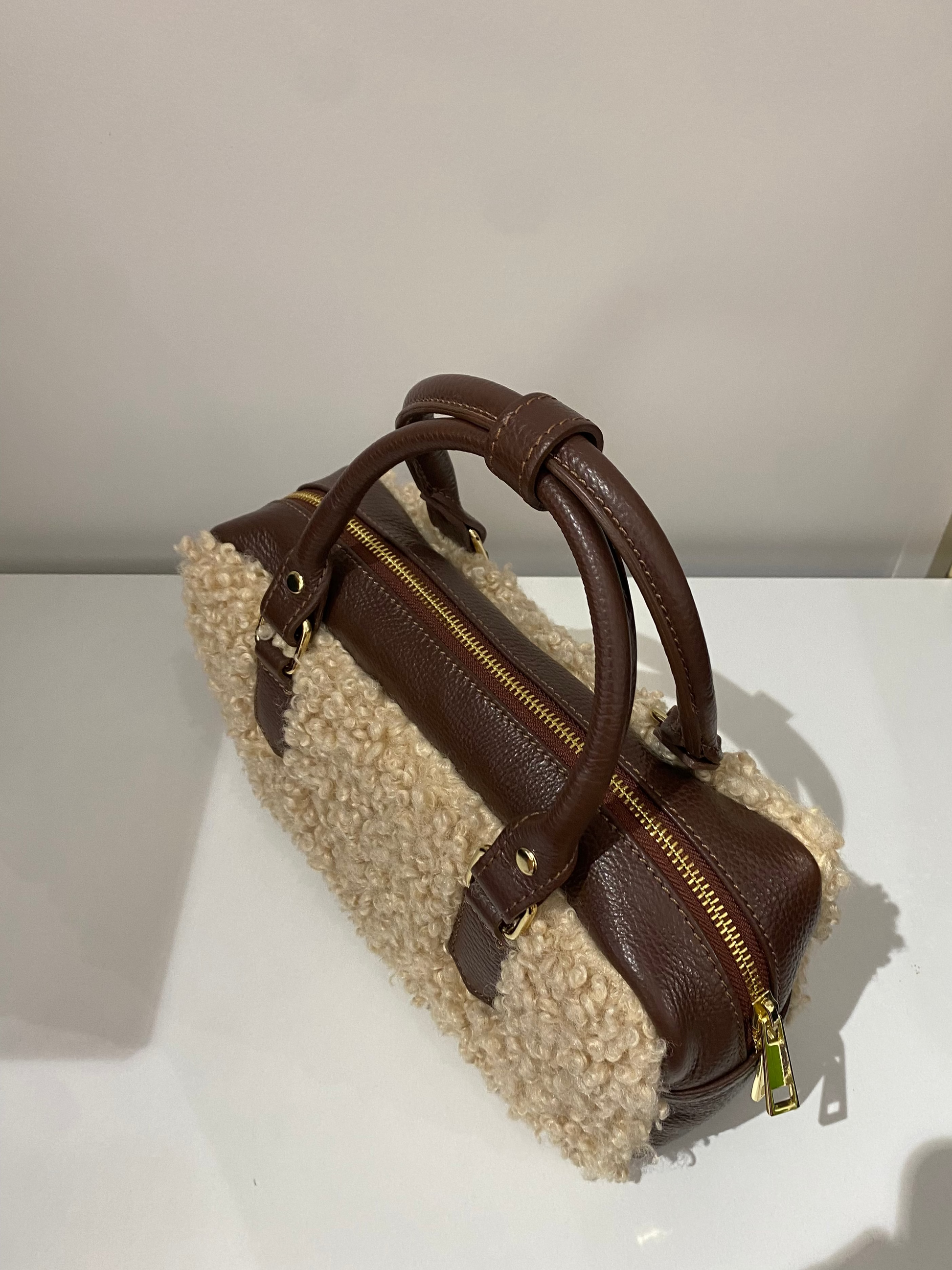 Borsa donna in tessuto teddy con manici e tracolla in pelle, dal design elegante e versatile. Chiusura con zip a doppio cursore, tasca interna porta documenti e fodera in tessuto di qualità. Tracolla regolabile e removibile per un look casual o raffinato. Dimensioni 28x14x10 cm: compatta, pratica e perfetta per ogni occasione