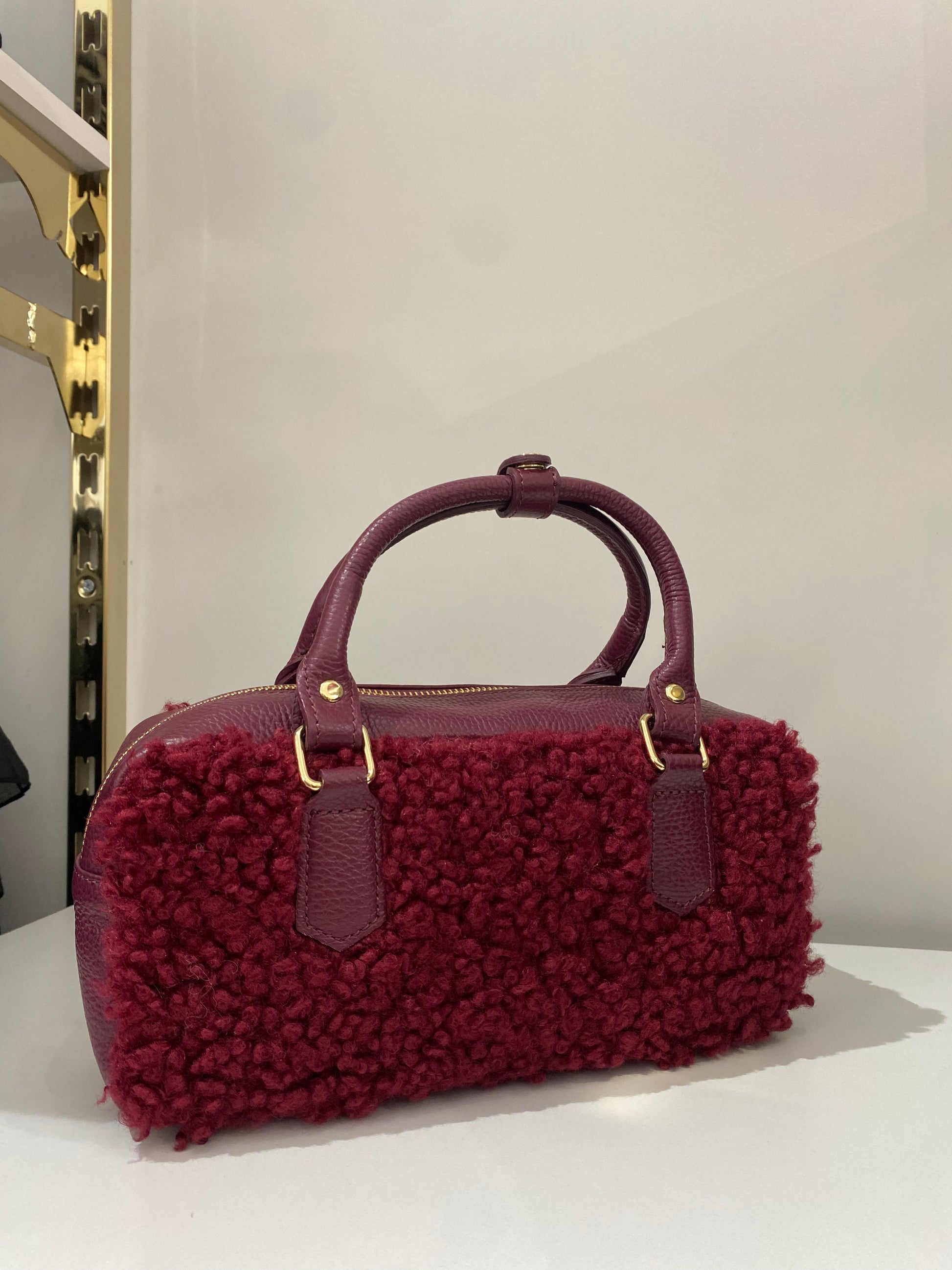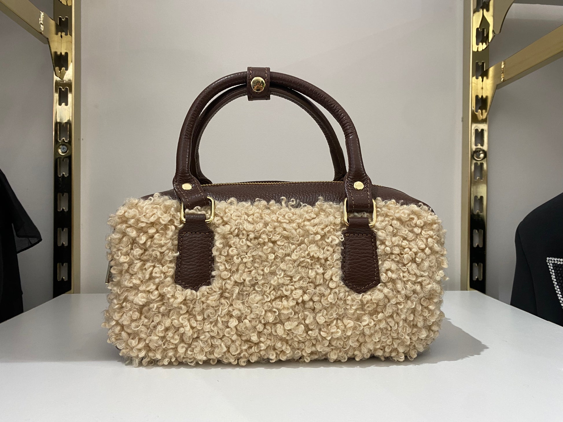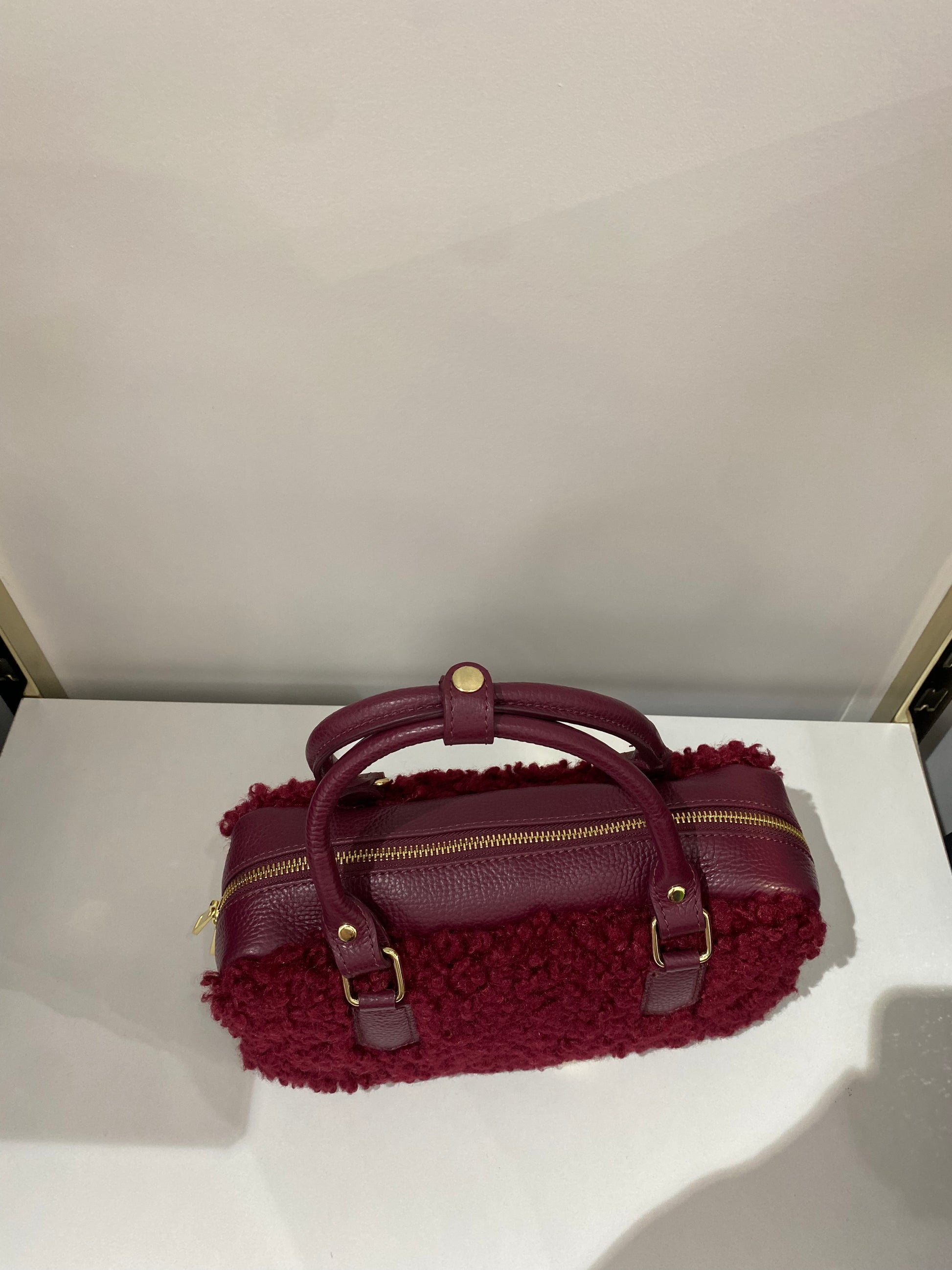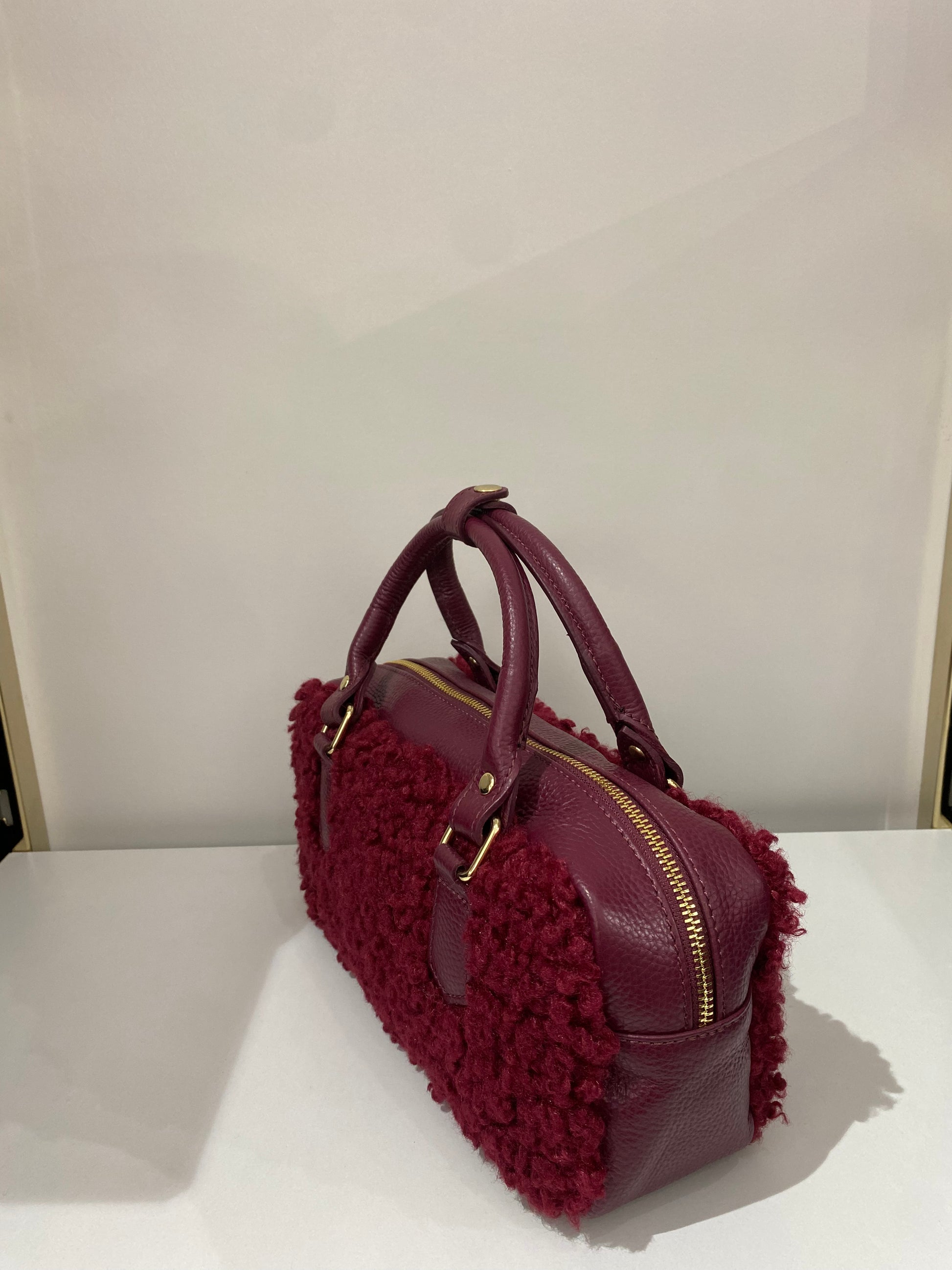 Borsa donna in tessuto teddy con manici e tracolla in pelle, dal design elegante e versatile. Chiusura con zip a doppio cursore, tasca interna porta documenti e fodera in tessuto di qualità. Tracolla regolabile e removibile per un look casual o raffinato. Dimensioni 28x14x10 cm: compatta, pratica e perfetta per ogni occasione