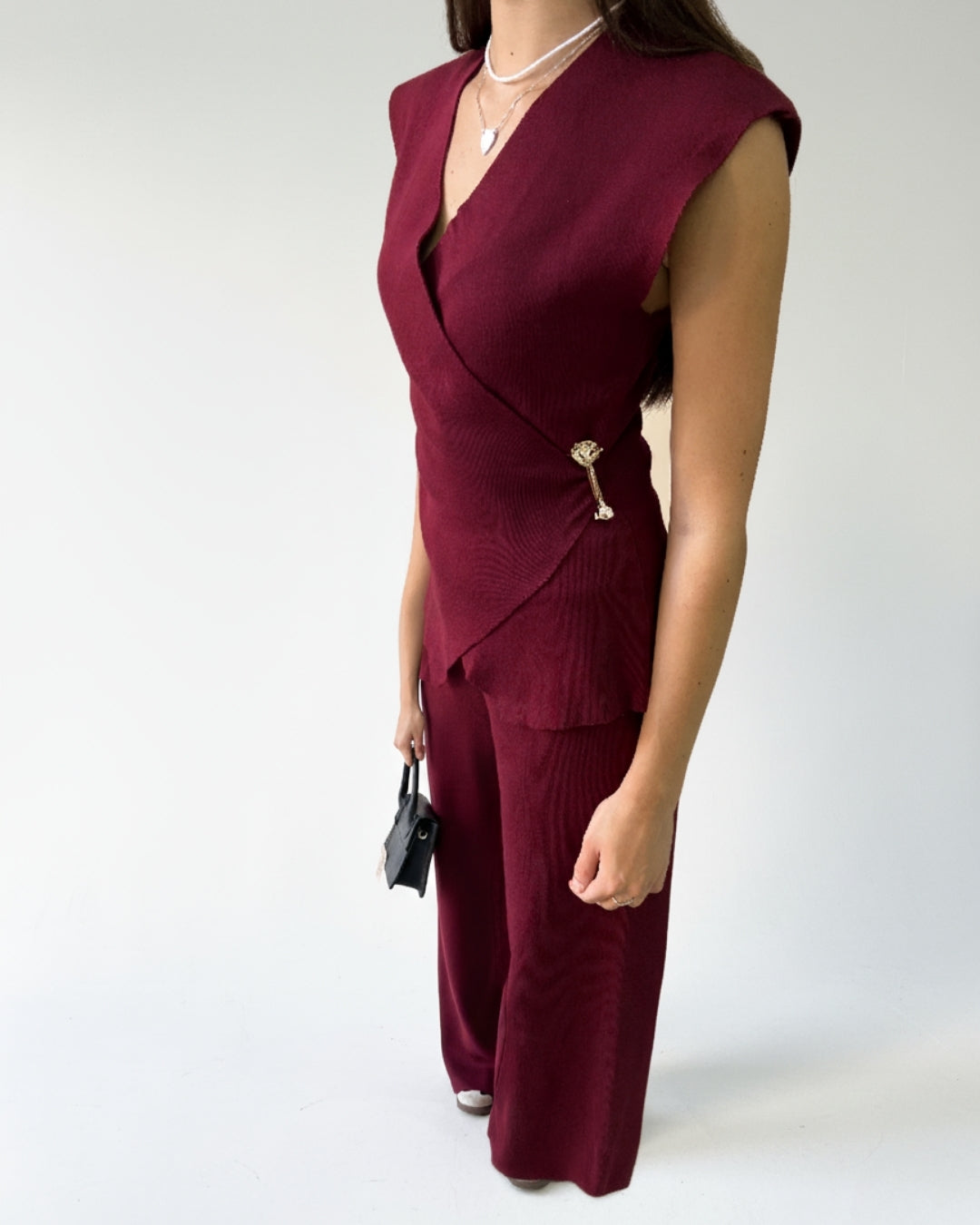 Scopri Aurora, il coordinato con maglia smanicata in punto dal design raffinato. Caratterizzato da uno scollo a V femminile, drappeggio elegante e dettaglio dorato che illumina il look. Disponibile in 4 varianti di colore, in taglia unica, è il capo versatile e chic perfetto per ogni occasione, dal lavoro agli eventi serali.