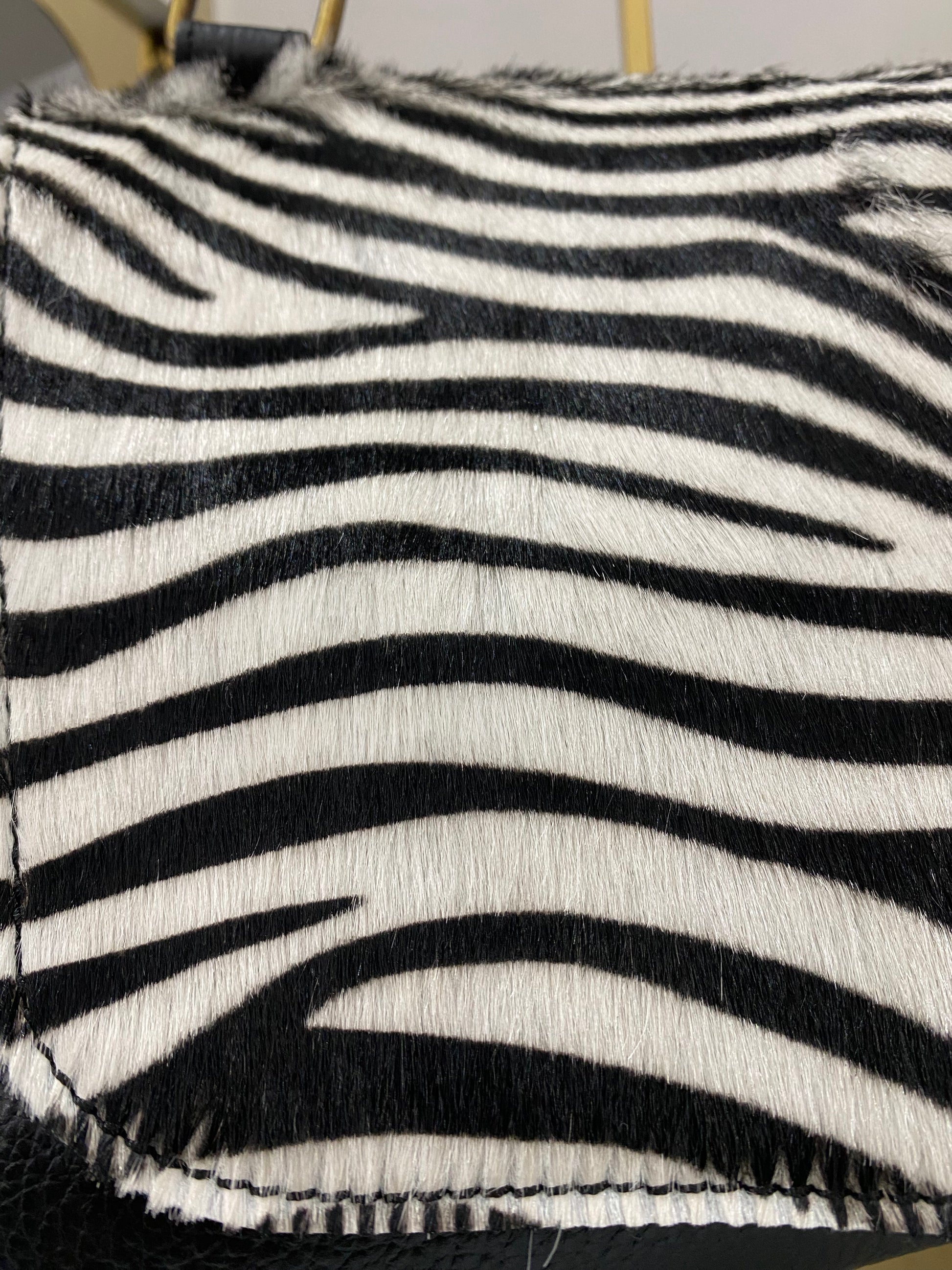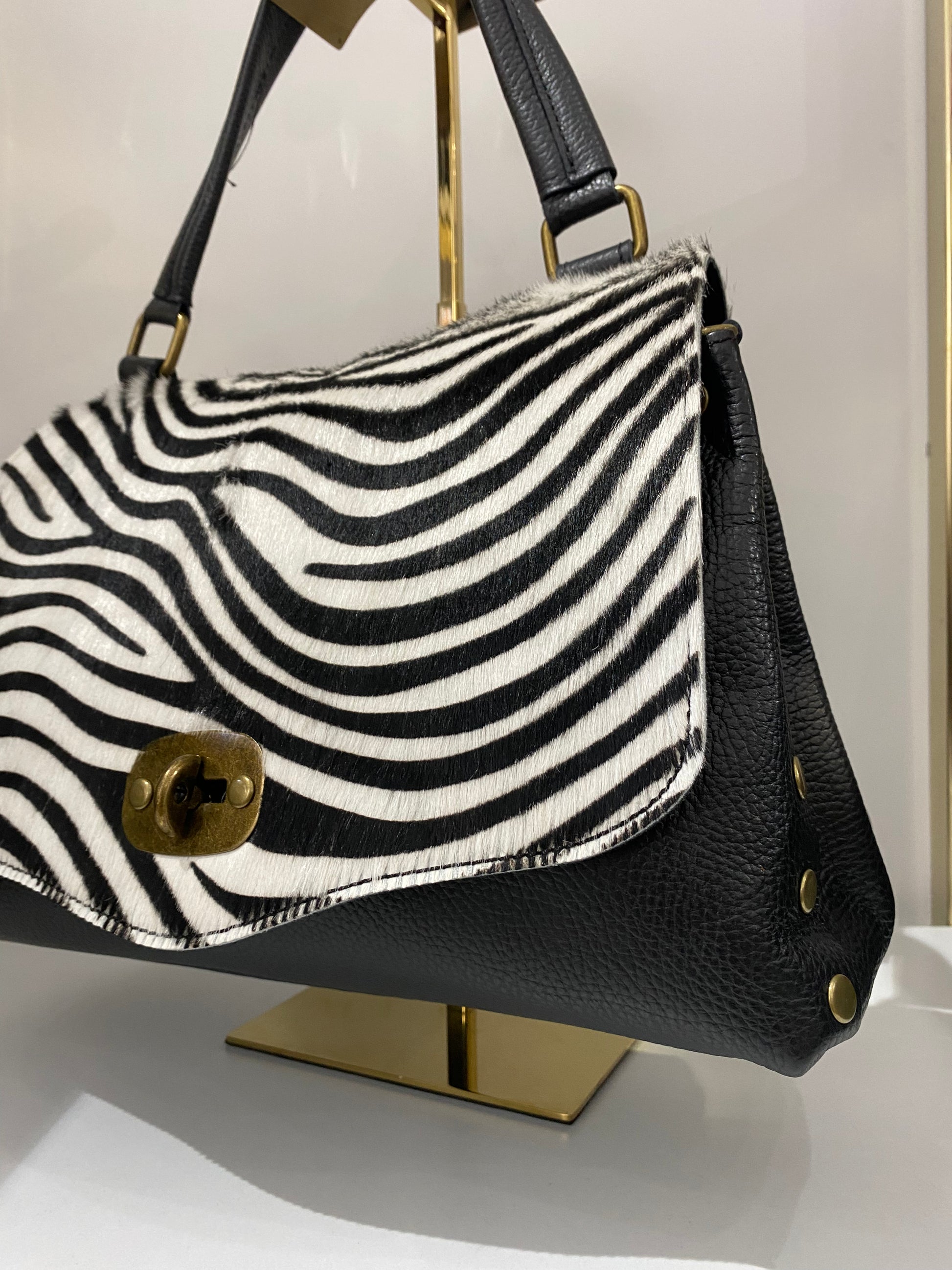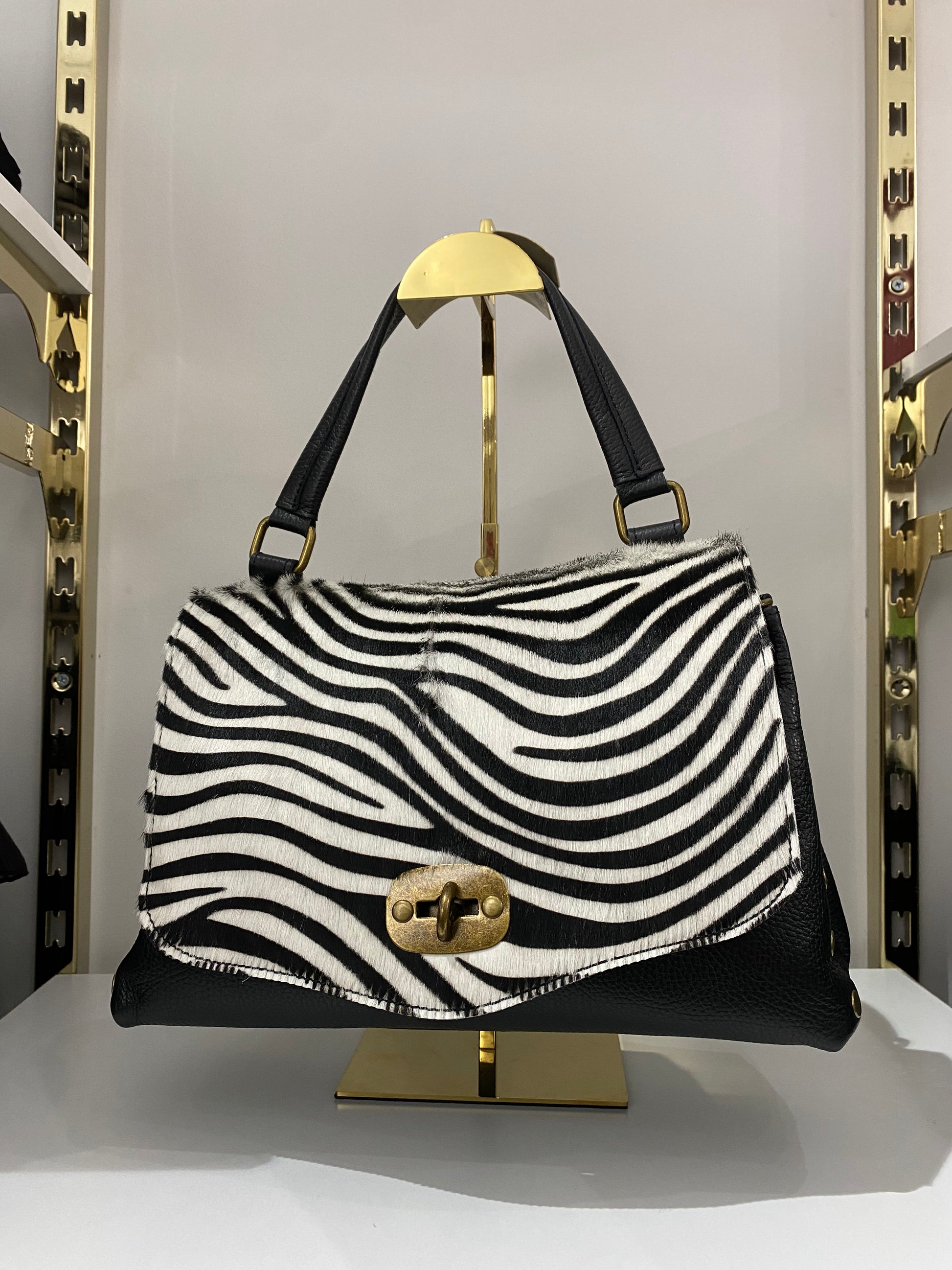 Borza Country è realizzata in vera pelle Made in Italy con patta in pelle effetto zebra, per un design unico e raffinato. Versatile e comoda, può essere indossata a mano o a spalla, rendendola l’accessorio perfetto per ogni occasione. La grande fibbia frontale aggiunge carattere e stile, unendo eleganza e praticità.”