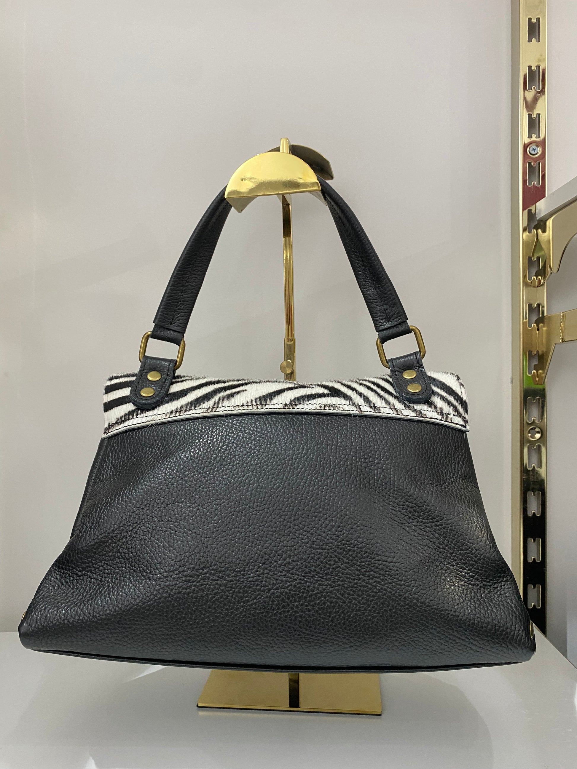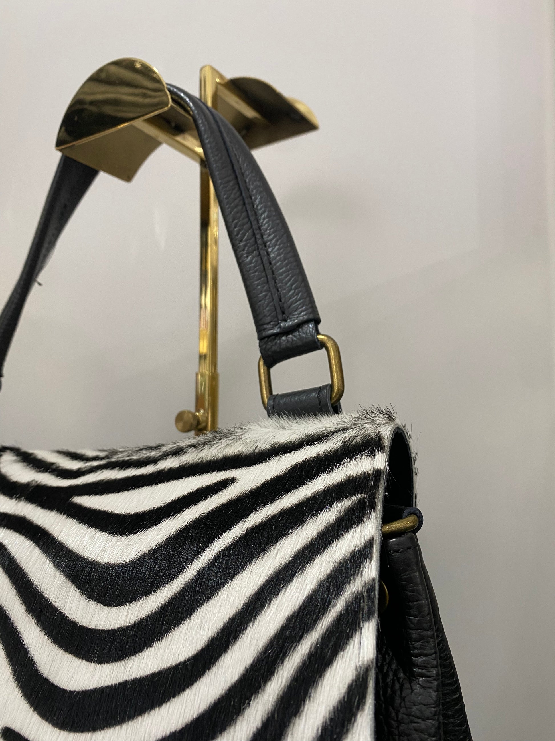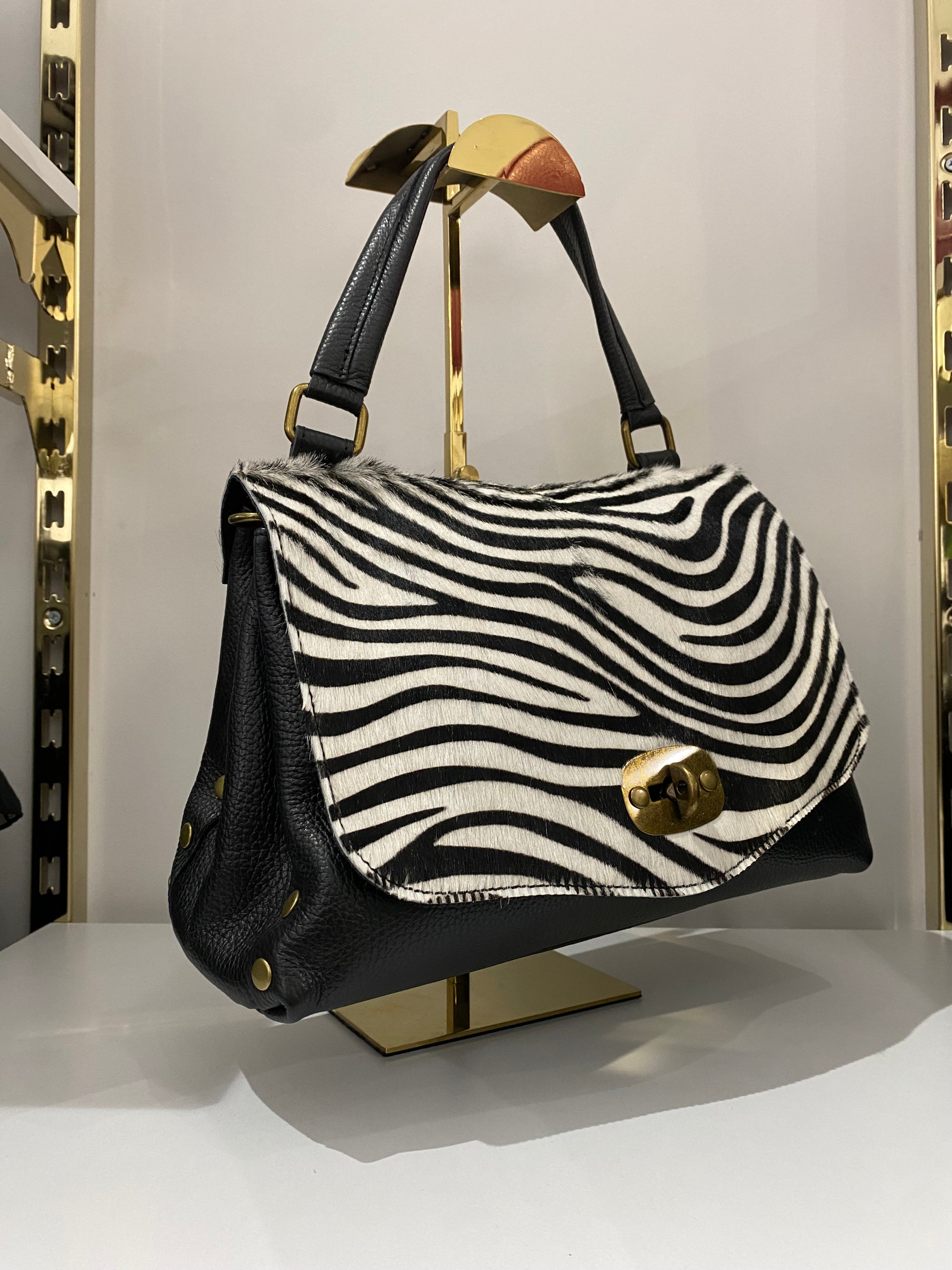 Borza Country è realizzata in vera pelle Made in Italy con patta in pelle effetto zebra, per un design unico e raffinato. Versatile e comoda, può essere indossata a mano o a spalla, rendendola l’accessorio perfetto per ogni occasione. La grande fibbia frontale aggiunge carattere e stile, unendo eleganza e praticità.”