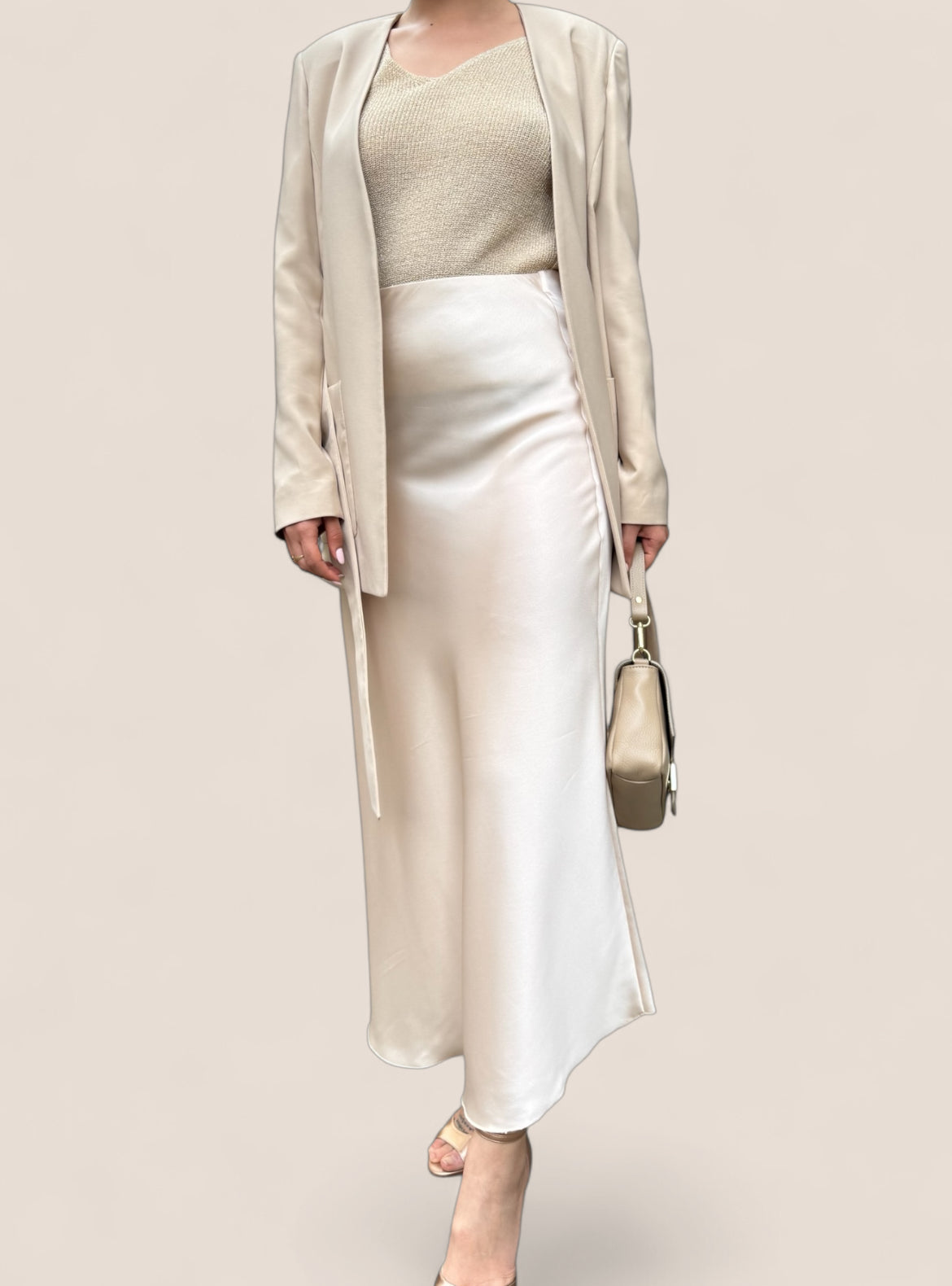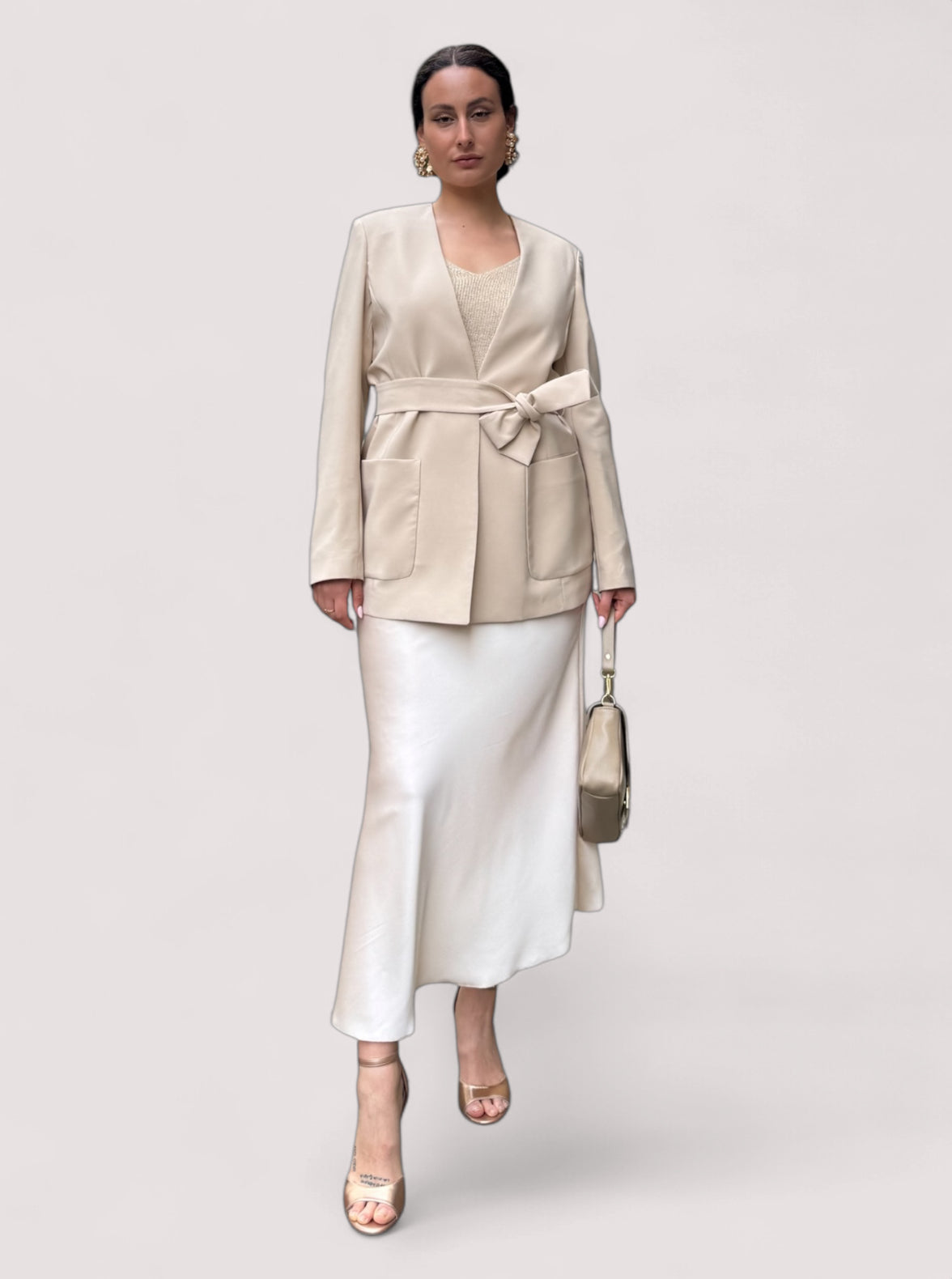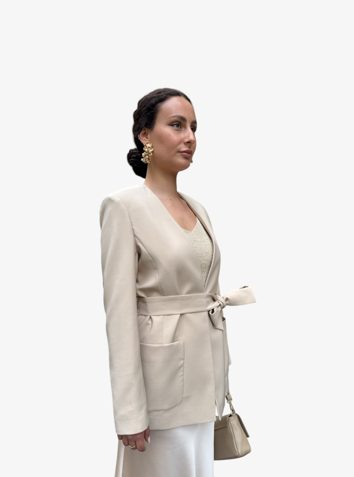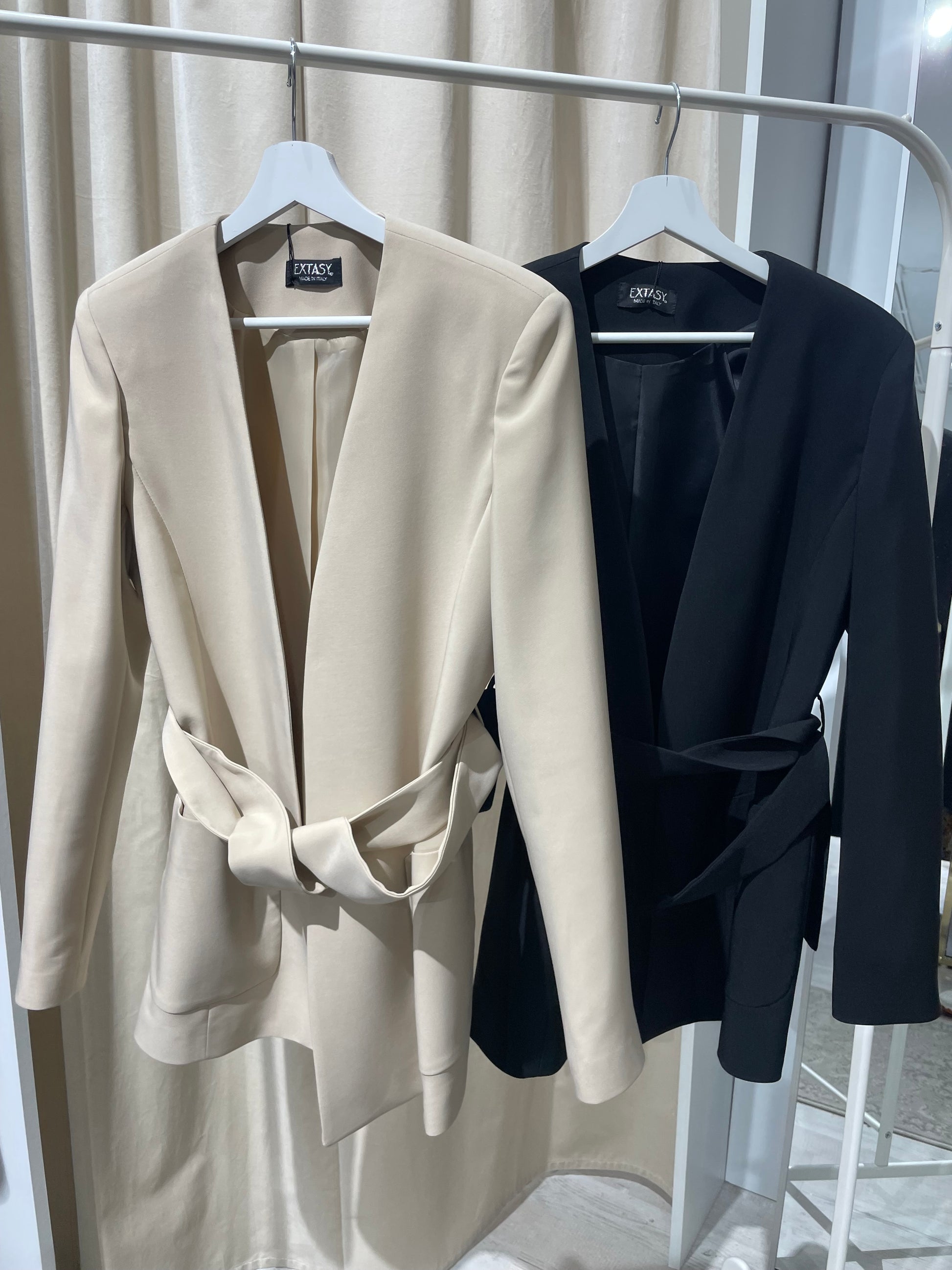 “Giacca senza collo dal taglio minimal-chic, arricchita da una cintura in vita che scolpisce la silhouette con stile. Il tessuto leggero e la linea pulita la rendono un must-have per un look sofisticato e contemporaneo.”