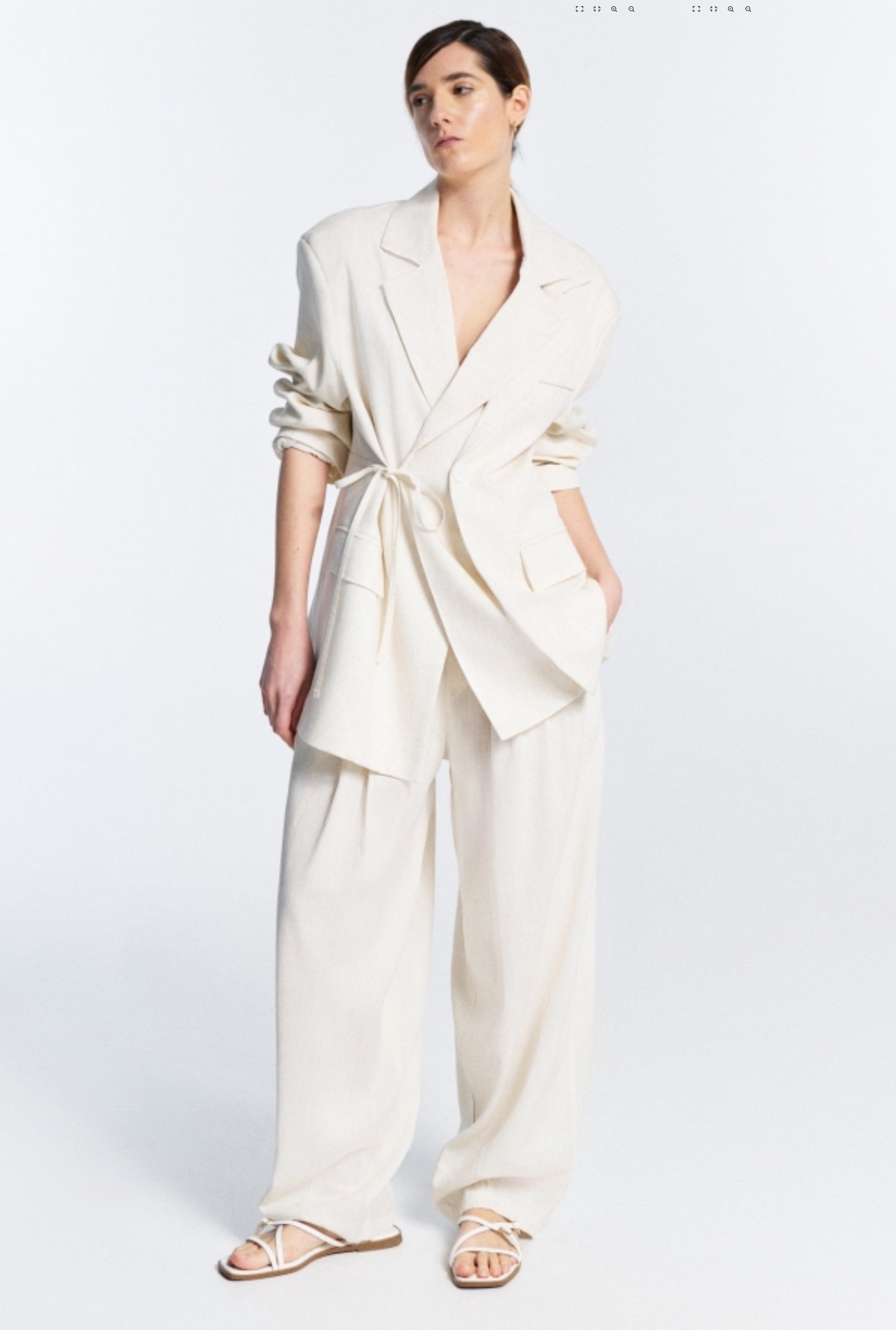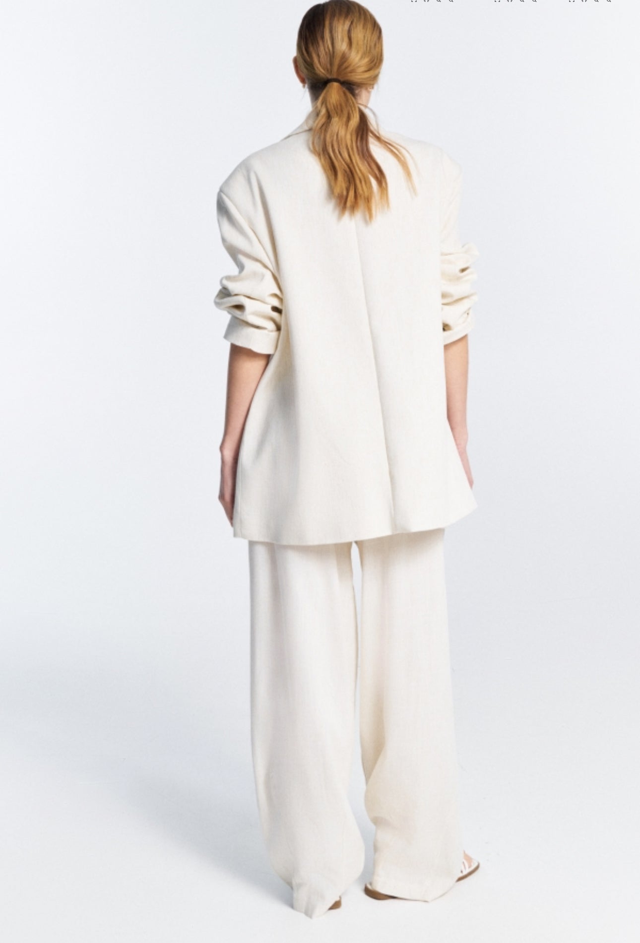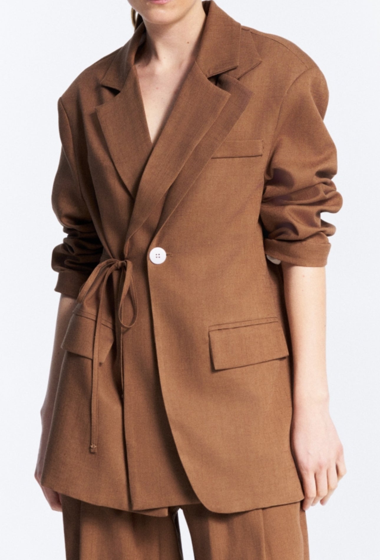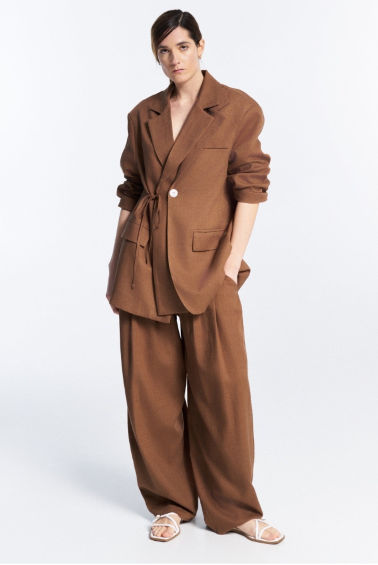 Completo donna composto da blazer oversize con cintura in vita e pantaloni ampi coordinati. Un look elegante, rilassato e leggero, perfetto per la stagione primavera/estate. Ideale per outfit daily chic o eventi informali.