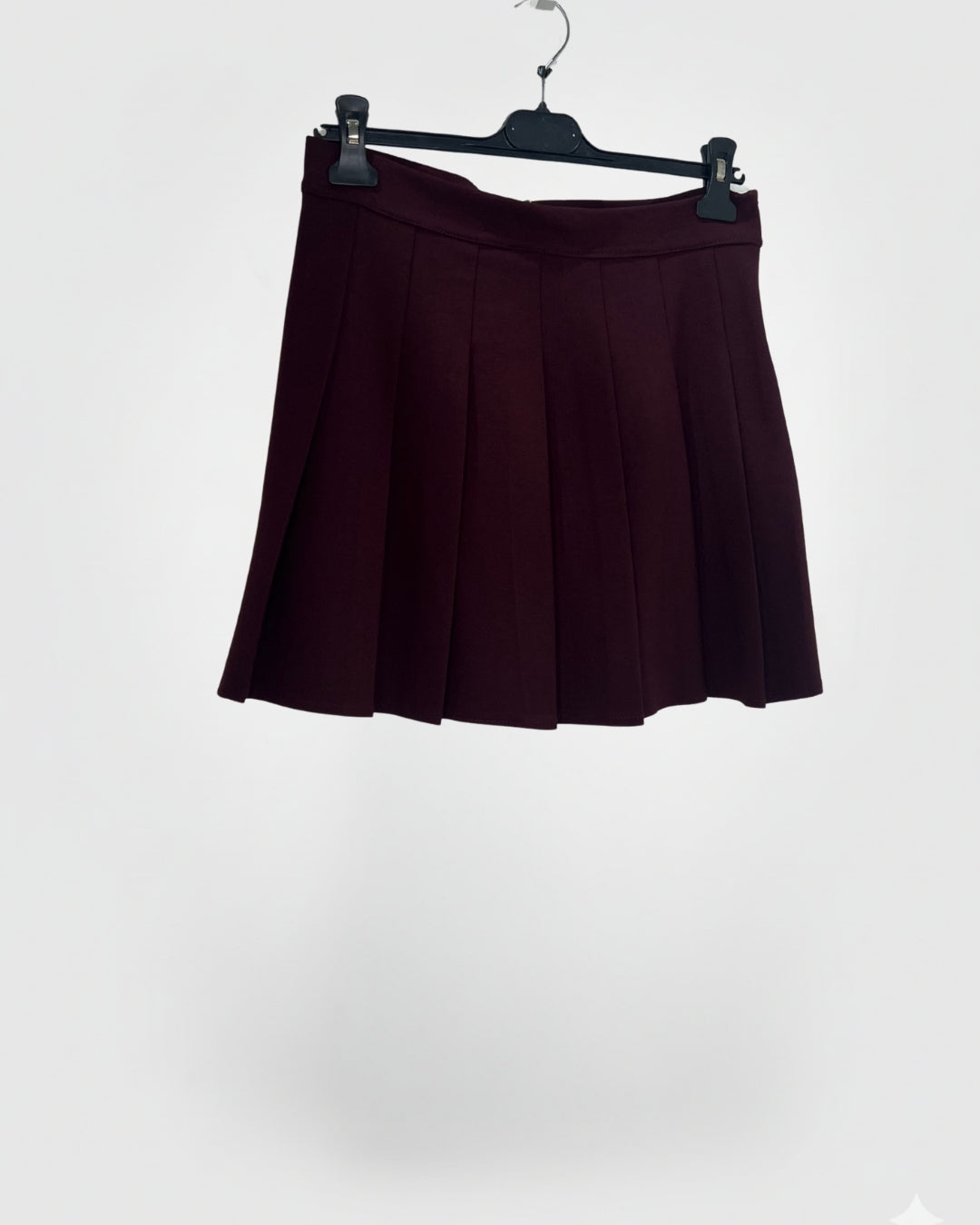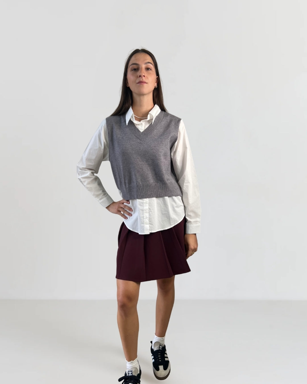 La Gonna Clara riprende il classico taglio scolaretta con pieghe regolari che donano movimento e freschezza al look. Realizzata in tessuto strutturato e versatile, è ideale per outfit casual chic, abbinata a camicie, gilet o blazer. Un capo intramontabile che unisce femminilità e carattere, perfetto per la quotidianità o per occasioni più ricercate.