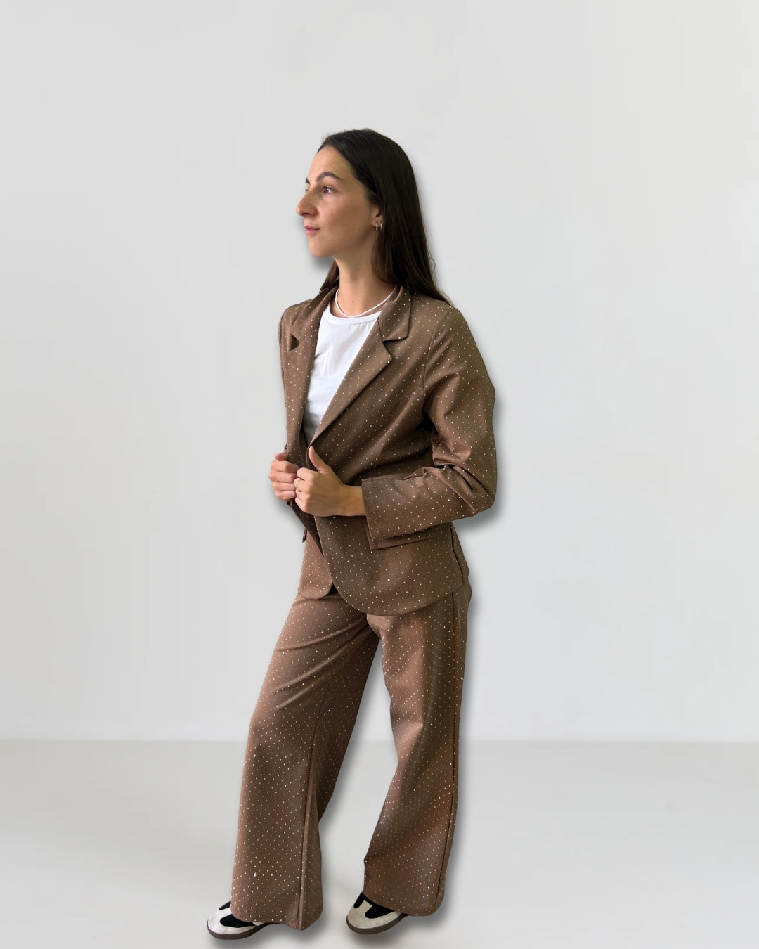 Il Completo Tailleur Brillant unisce eleganza e luminosità grazie al design arricchito da strass scintillanti. Composto da giacca e pantalone coordinati, è disponibile in 3 colorazioni raffinate che esaltano ogni occasione speciale. Perfetto per chi cerca uno stile sofisticato e di tendenza, questo tailleur brillantinato dona carattere e femminilità a ogni look.